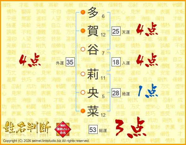 多(6画)賀(12画)谷(7画) 莉(11画)央(5画)菜(12画)