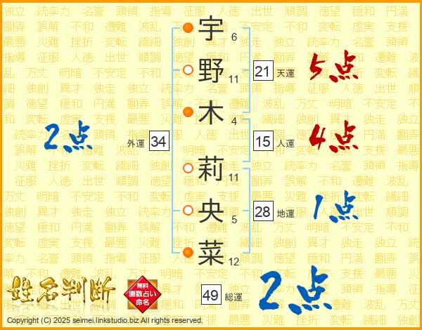 宇(6画)野(11画)木(4画) 莉(11画)央(5画)菜(12画)