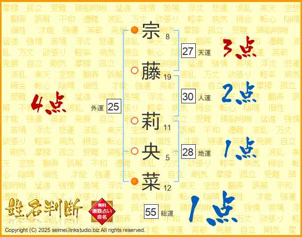 宗(8画)藤(19画) 莉(11画)央(5画)菜(12画)