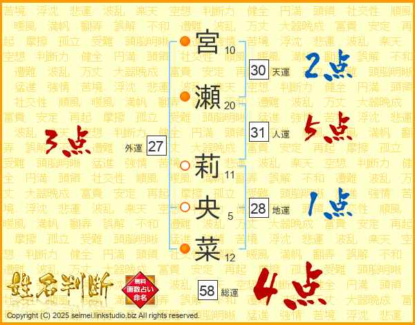 宮(10画)瀬(20画) 莉(11画)央(5画)菜(12画)