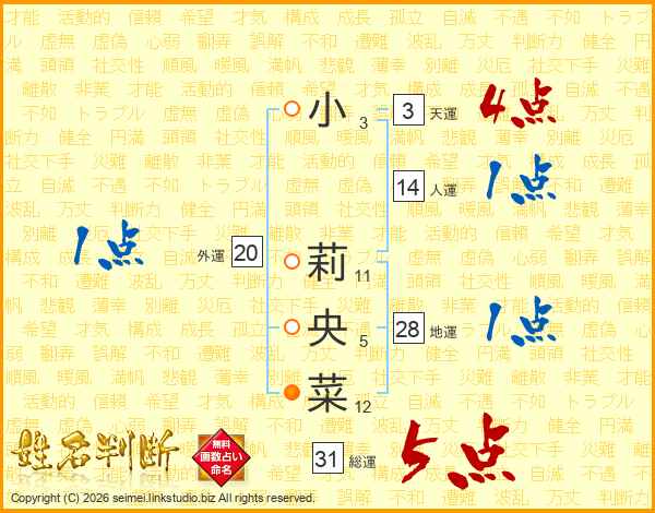 小莉央菜さんの総運は31画の5点!