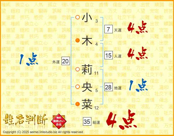 小(3画)木(4画) 莉(11画)央(5画)菜(12画)