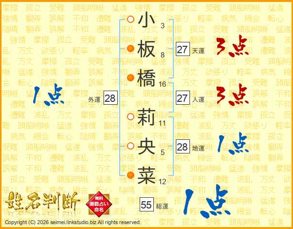 小(3画)板(8画)橋(16画) 莉(11画)央(5画)菜(12画)