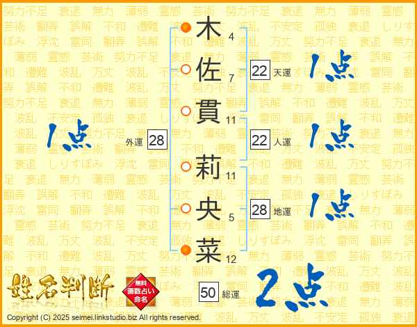 木(4画)佐(7画)貫(11画) 莉(11画)央(5画)菜(12画)