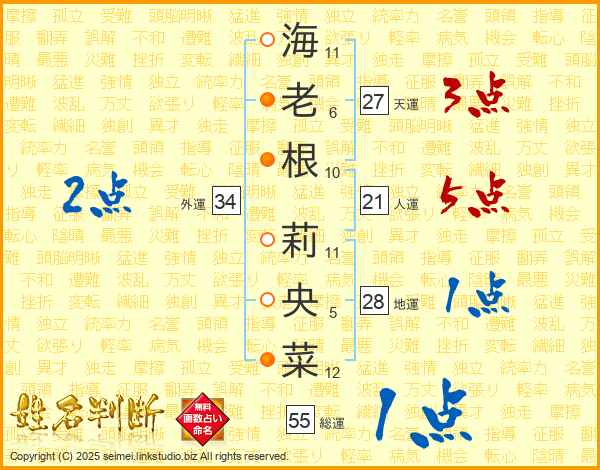 海(11画)老(6画)根(10画) 莉(11画)央(5画)菜(12画)