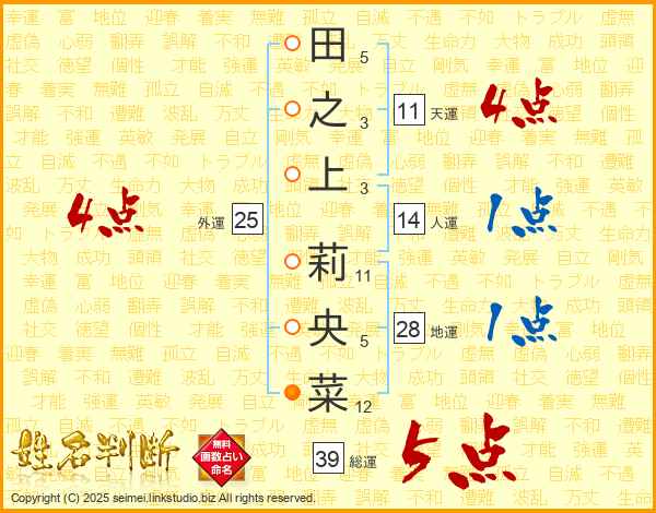 田(5画)之(3画)上(3画) 莉(11画)央(5画)菜(12画)