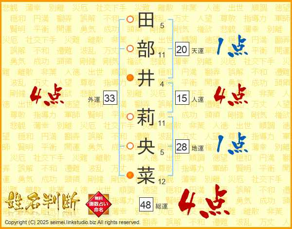 田(5画)部(11画)井(4画) 莉(11画)央(5画)菜(12画)