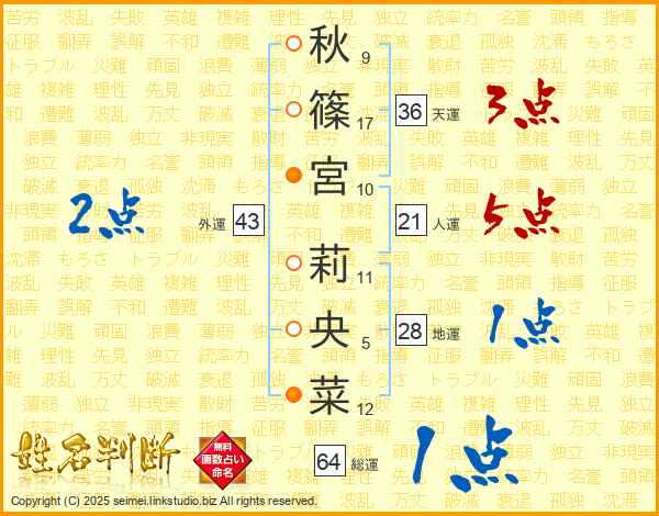 秋(9画)篠(17画)宮(10画) 莉(11画)央(5画)菜(12画)