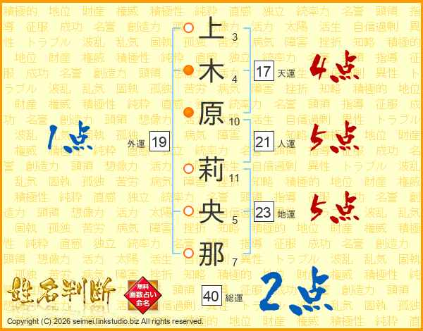 上(3画)木(4画)原(10画) 莉(11画)央(5画)那(7画)