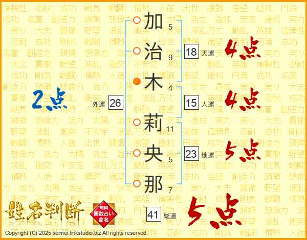 加(5画)治(9画)木(4画) 莉(11画)央(5画)那(7画)