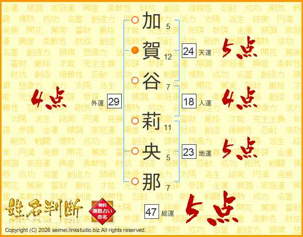 加(5画)賀(12画)谷(7画) 莉(11画)央(5画)那(7画)