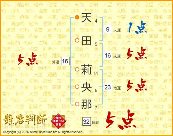 天(4画)田(5画) 莉(11画)央(5画)那(7画)