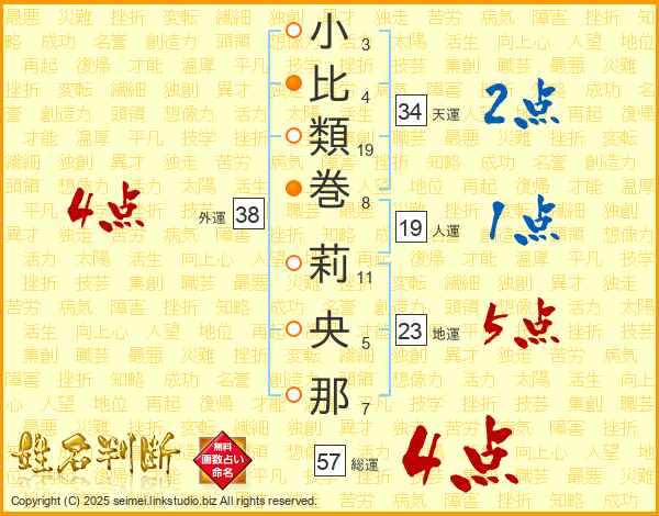 小(3画)比(4画)類(19画)巻(8画) 莉(11画)央(5画)那(7画)