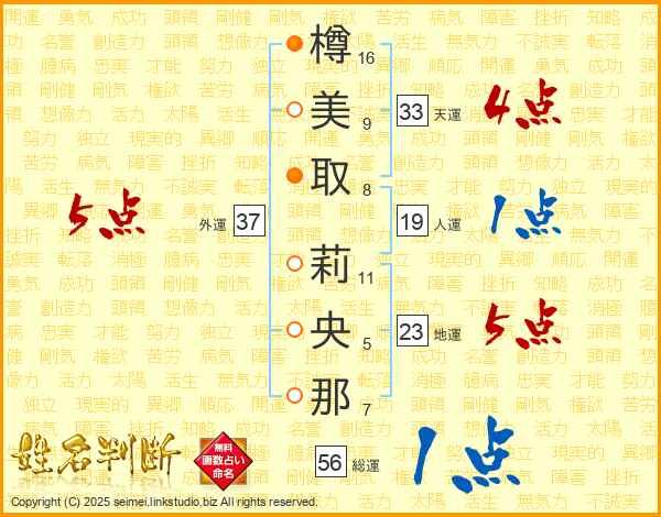 樽(16画)美(9画)取(8画) 莉(11画)央(5画)那(7画)