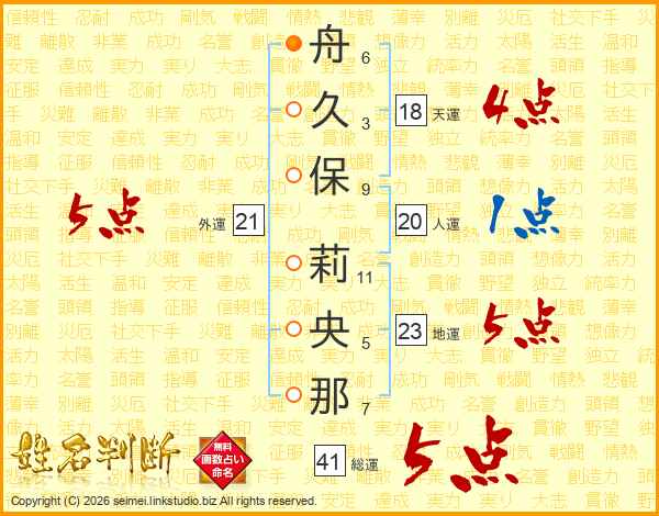 舟(6画)久(3画)保(9画) 莉(11画)央(5画)那(7画)
