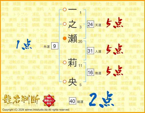 一(1画)之(3画)瀬(20画) 莉(11画)央(5画)
