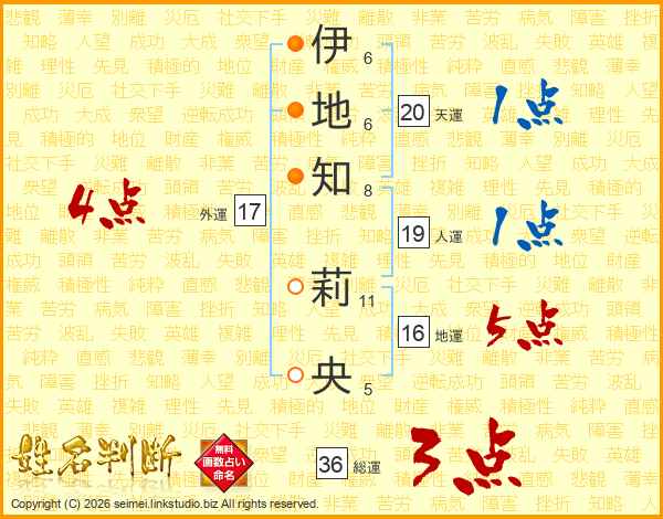 伊(6画)地(6画)知(8画) 莉(11画)央(5画)