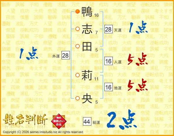 鴨志田莉央さんの総運は44画の2点!