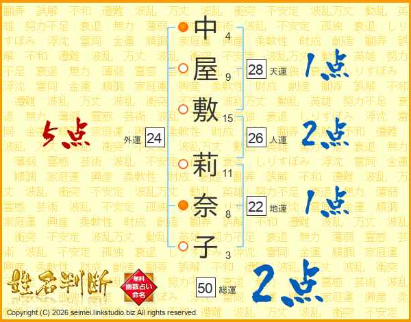 中(4画)屋(9画)敷(15画) 莉(11画)奈(8画)子(3画)