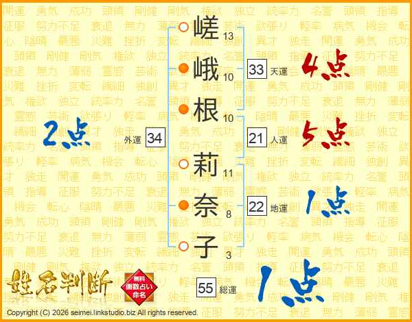 嵯峨根莉奈子さんの総運は55画の1点!