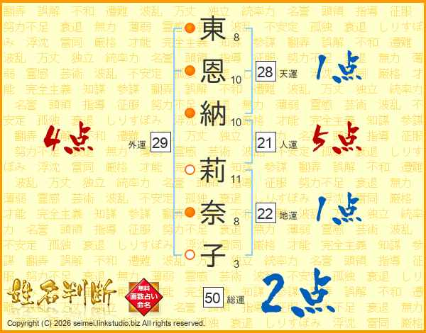 東恩納莉奈子さんの総運は50画の2点!