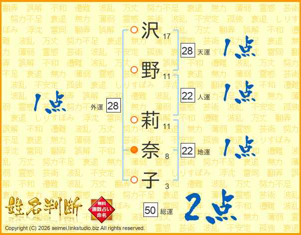 沢(17画)野(11画) 莉(11画)奈(8画)子(3画)