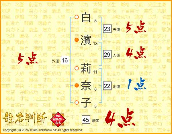 白(5画)濱(18画) 莉(11画)奈(8画)子(3画)