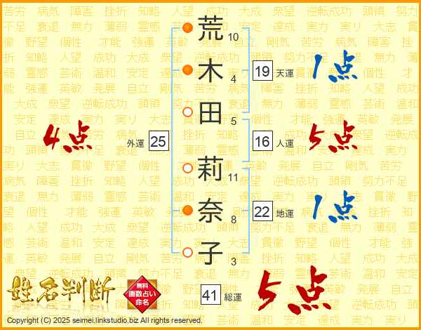 荒(10画)木(4画)田(5画) 莉(11画)奈(8画)子(3画)