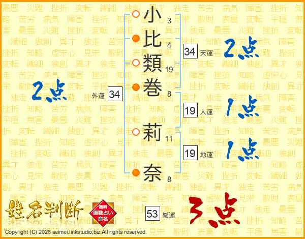小(3画)比(4画)類(19画)巻(8画) 莉(11画)奈(8画)