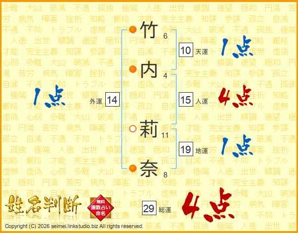竹内莉奈さんの総運は29画の4点!