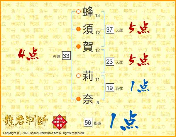 蜂(13画)須(12画)賀(12画) 莉(11画)奈(8画)