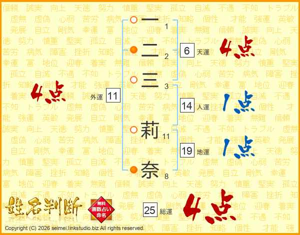 一二三莉奈さんの総運は25画の4点!