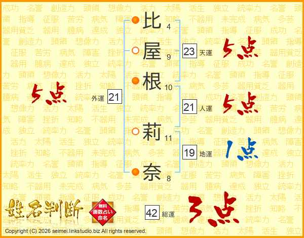 比(4画)屋(9画)根(10画) 莉(11画)奈(8画)
