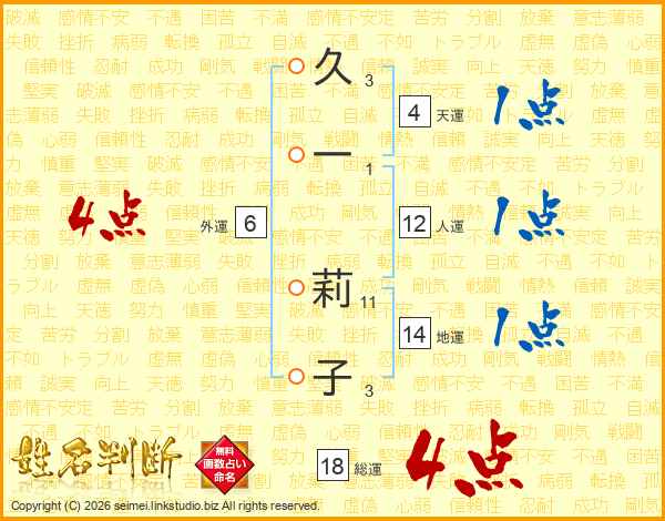 久(3画)一(1画) 莉(11画)子(3画)