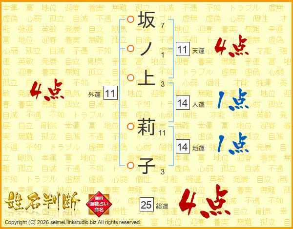 坂(7画)ノ(1画)上(3画) 莉(11画)子(3画)