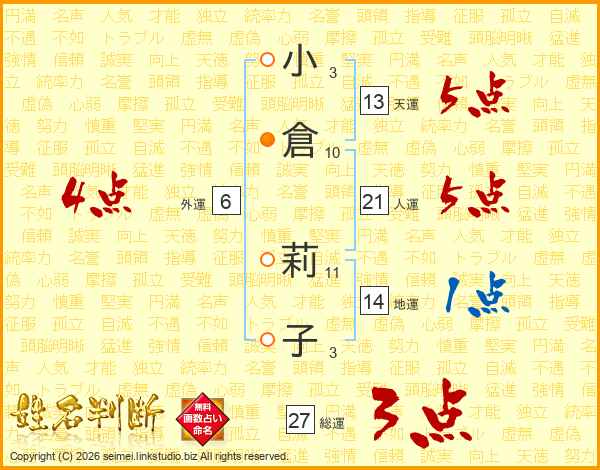 小倉莉子さんの総運は27画の3点!
