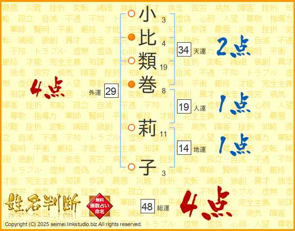 小(3画)比(4画)類(19画)巻(8画) 莉(11画)子(3画)