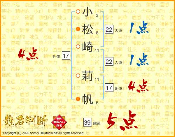 小(3画)松(8画)崎(11画) 莉(11画)帆(6画)