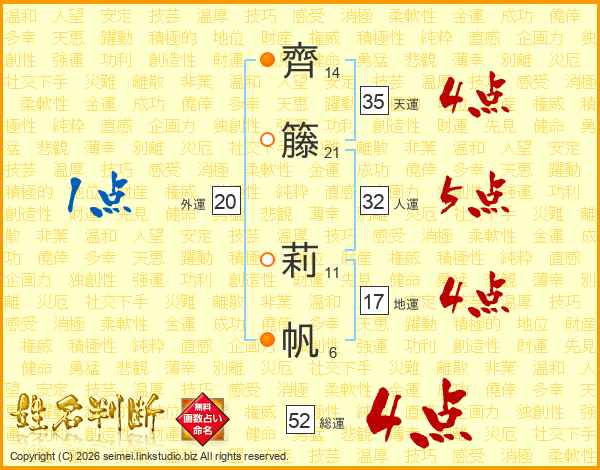 齊(14画)籐(21画) 莉(11画)帆(6画)