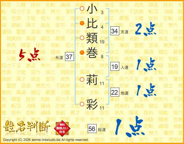 小(3画)比(4画)類(19画)巻(8画) 莉(11画)彩(11画)