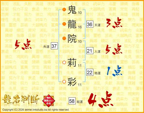 鬼(10画)龍(16画)院(10画) 莉(11画)彩(11画)