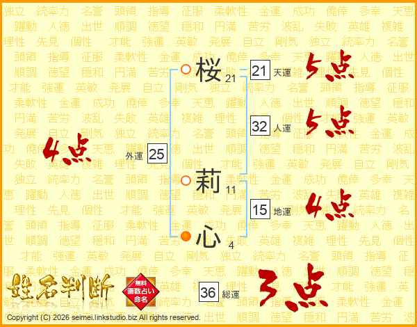 桜(21画) 莉(11画)心(4画)