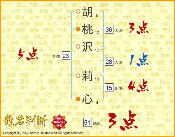 胡(9画)桃(10画)沢(17画) 莉(11画)心(4画)