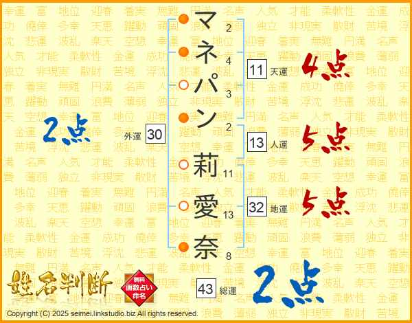 マ(2画)ネ(4画)パ(3画)ン(2画) 莉(11画)愛(13画)奈(8画)
