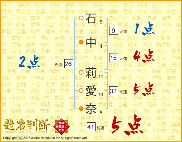 石(5画)中(4画) 莉(11画)愛(13画)奈(8画)