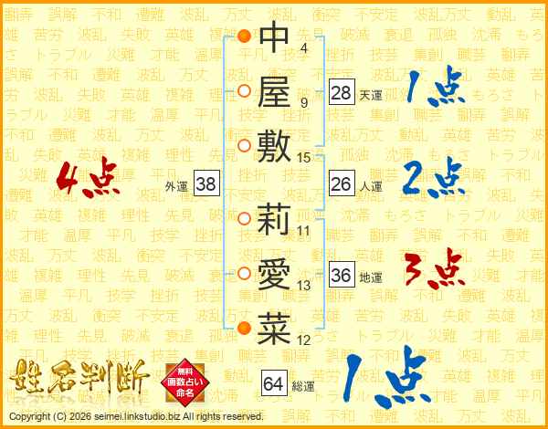 中(4画)屋(9画)敷(15画) 莉(11画)愛(13画)菜(12画)