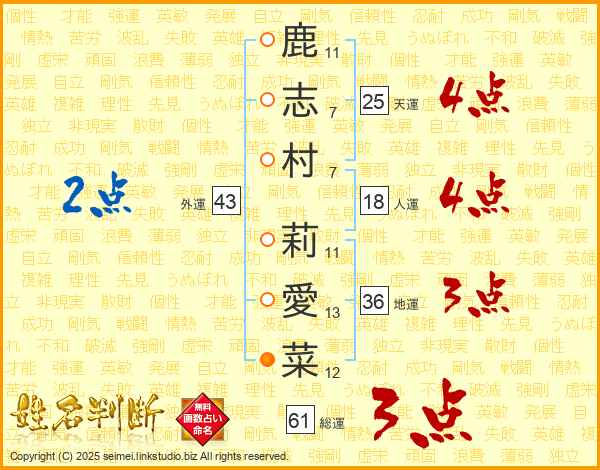 鹿(11画)志(7画)村(7画) 莉(11画)愛(13画)菜(12画)