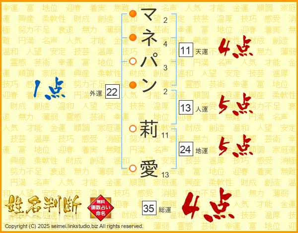 マ(2画)ネ(4画)パ(3画)ン(2画)  莉(11画)愛(13画)