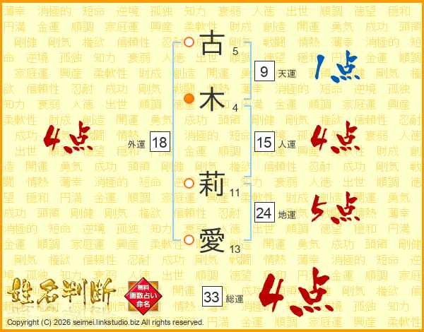 古(5画)木(4画) 莉(11画)愛(13画)