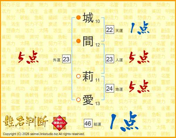 城(10画)間(12画) 莉(11画)愛(13画)